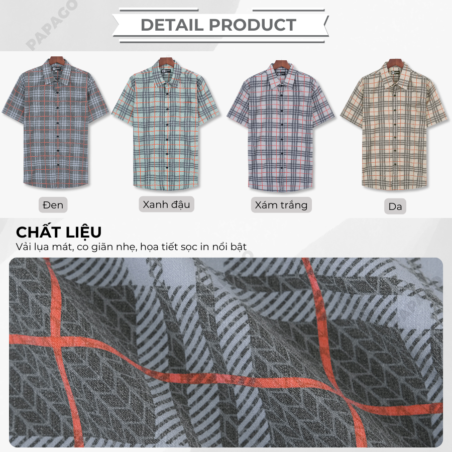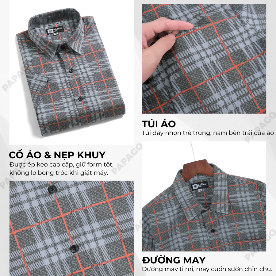 Áo sơ mi nam trung niên PAPAGO tay ngắn lai bầu vải lụa sọc caro - P23SNCR004